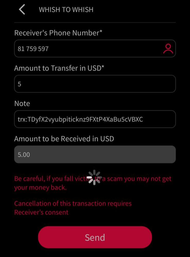 You can buy USDT TRC20 by sending a payment on whish to 81 759 597 with your USDT address USDT TRC20 address as the note.